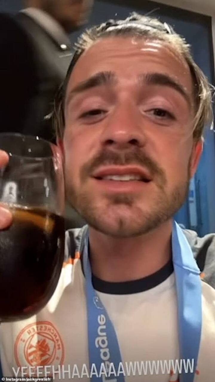 Jack Grealish and Erling Haaland led the revelry as Manchester City's stars celebrated a historic fourth consecutive league title on Sunday night in Manchester.