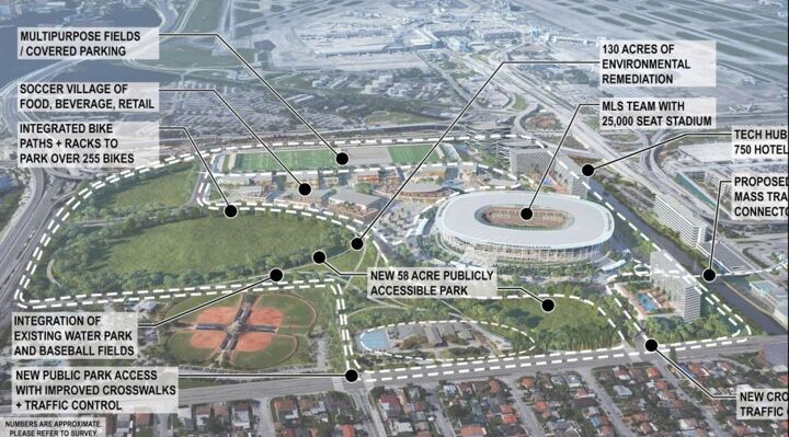 This land will feature a 58-acre public park - the largest activated park in Miami - and will feature youth athletic fields for the community, entertainment-based retail and attractions, restaurants, hotels, shops, office space and an entertainment venue to host major international stars in addition to concerts that will take place in the stadium.