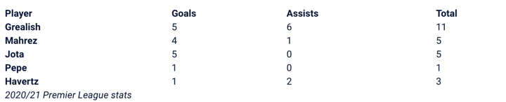 So far this season, Grealish has bagged five assists in the Premier League. Which puts him second only to Harry Kane, with more than Kai Havertz, Diogo Jota, Nicolas Pepe and Riyad Mahrez combined. The Villa midfielder also has five goals in nine games, which has him sitting level with Liverpool’s Jota, but again ahead of Mahrez (four), Pepe (one) and Havertz (one).