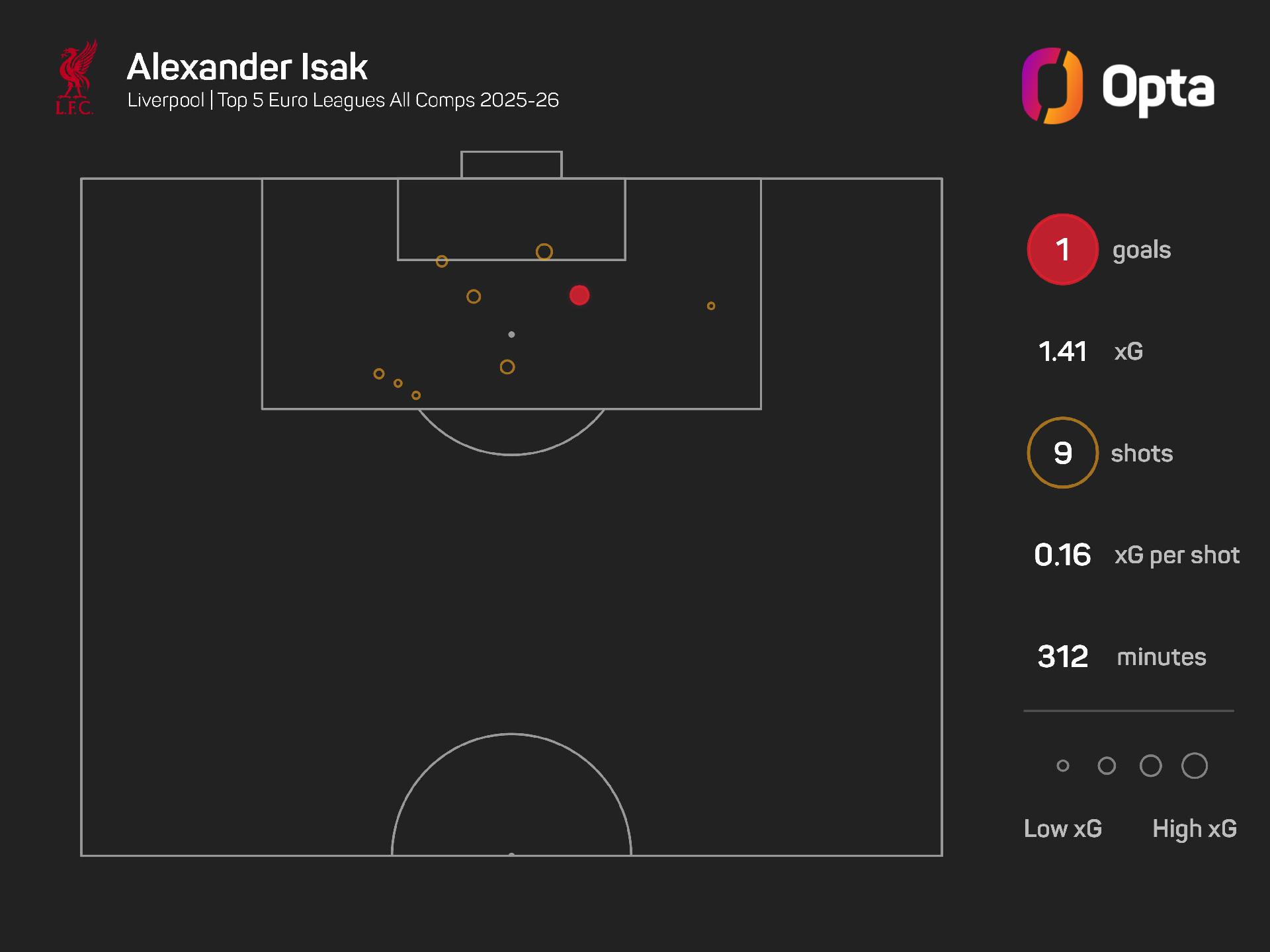 Isak has made four starts and played 312 minutes overall for Liverpool, getting four of his nine shots on target while underperforming his tally of 1.41 expected goals (xG).