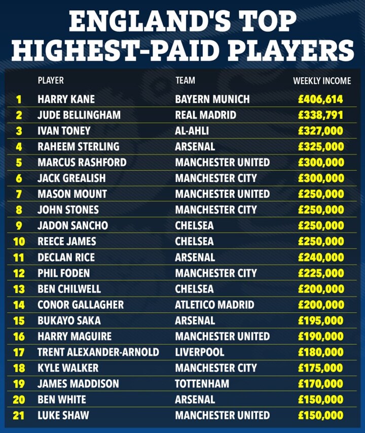Four English footballers are earning £250,000-a-week, those being; Mason Mount, John Stones, Reece James and Jadon Sancho.