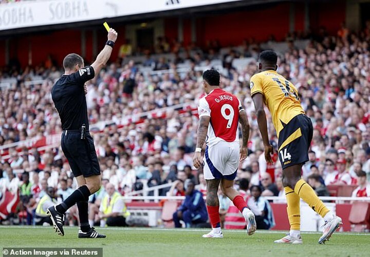 Gabriel Jesus picked up what has been dubbed the strangest booking of the season so far in Arsenal's win over Wolves.