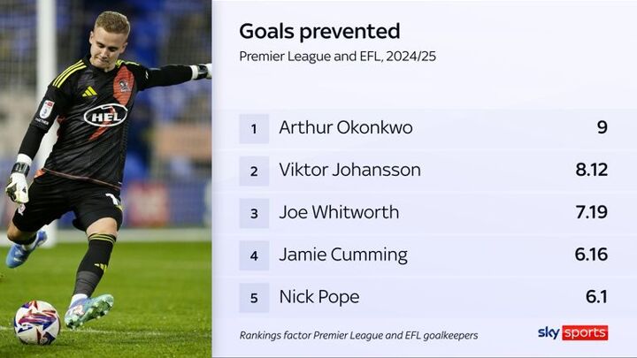 He has the joint-most clean sheets across the Premier League and the EFL (9) - along with Sheffield United's Michael Cooper and Leeds' Illan Meslier - and the best save percentage of any EFL goalkeeper to have played at least 300 minutes this term (83.6 per cent).