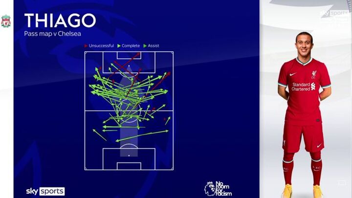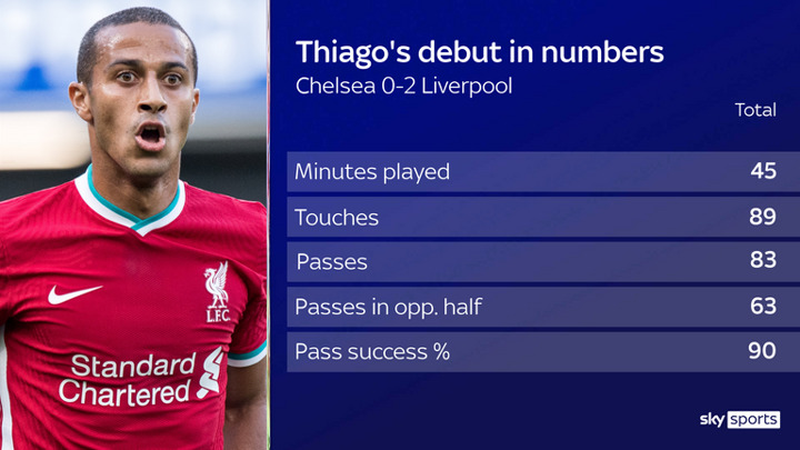 An injury to Jordan Henderson saw Thiago thrust into action after the interval against Chelsea, just 48 hours after joining the club. And Thiago did not disappoint, completing a record-breaking 75 passes, the most of any player playing at least 45 minutes in a Premier League game since Opta stats began.