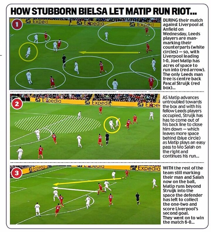With Leeds’ players man-marking and naively allowing themselves to be pulled out of position by their opponents’ decoy runs, United and Liverpool’s centre backs Victor Lindelof and Joel Matip figured out that they always had an ocean of space in front of them to charge into.