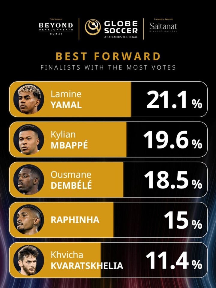 On 11 December, The Globe Soccer Awards have announced the results of the 2025 Best Forward voting. Barcelona star Yamal comes in first place with 21.1% of the vote, Real Madrid star Mbappé comes in second with 19.6% of the vote, and Paris Saint-Germain star Dembélé comes in third with 18.5% of the vote.