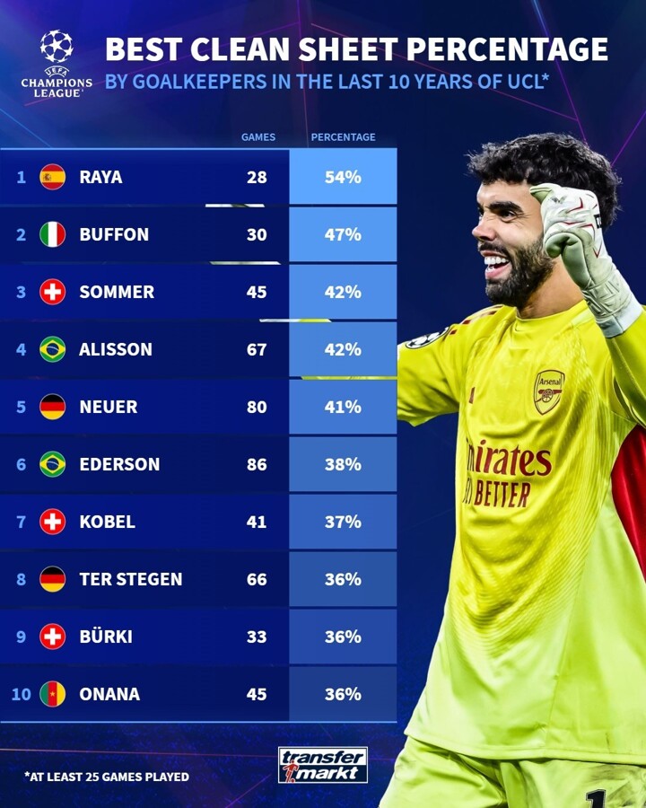 Clean sheet rates of UCL goalkeepers in the past decade: Raya 1st, Buffon 2nd