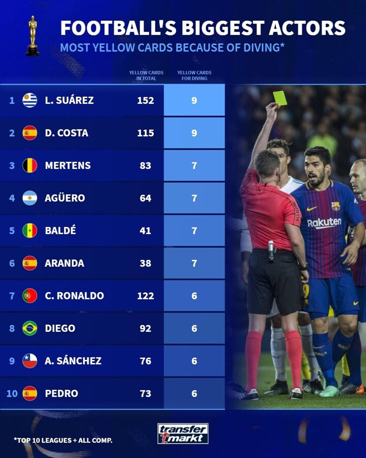 Transfermarkt lists players who get the most yellow cards because of diving