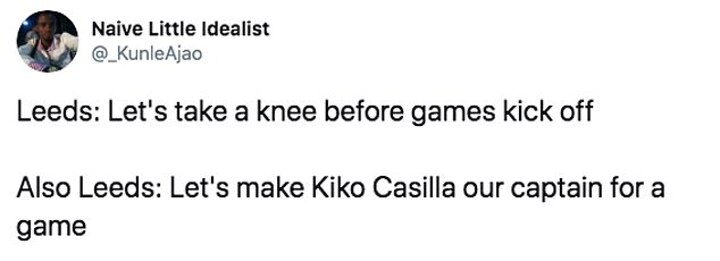 One Twitter user wrote: 'Please, why is Kiko Casilla still at Leeds, how is being guilty of racism not violation of contract and a kick in the teeth to play him and captain him.