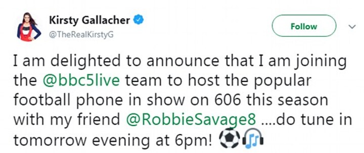 'I'm excited to be joining the team at BBC Radio 5 Live and I can't wait to pair up with Robbie Savage on Saturdays to hear from fans, who we know will always be brutally honest, about their team's performance.'