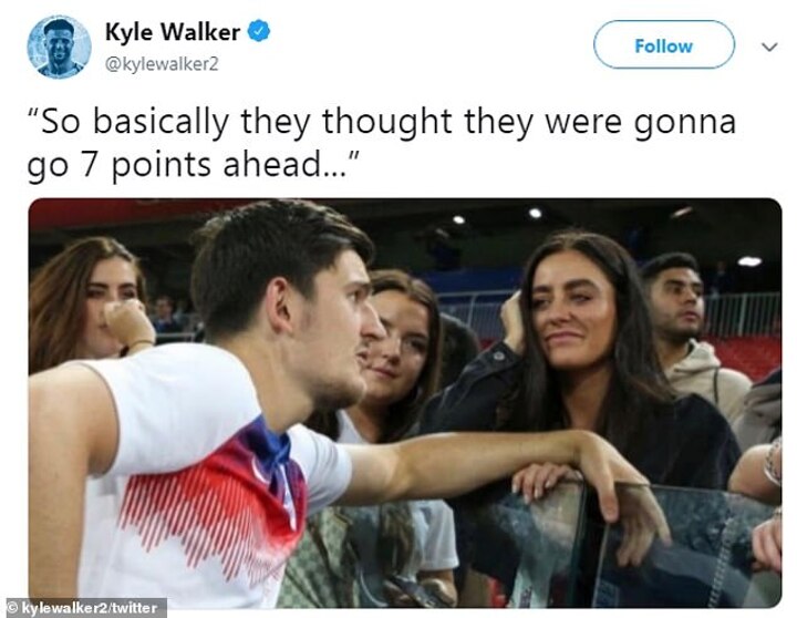 Walker took to social media on Thursday afternoon to poke fun at Mohamed Salah and Co after they dropped points, sharing the popular image of goalscorer Maguire talking to his partner Fern Hawkins during last summer's World Cup in Russia.