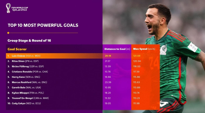 Leading the Top 10 goals from the Group Stage and Round of 16 combined is Luis Chávez's spectacular free-kick, in Mexico's 2-1 win over Saudi Arabia on match day three. The distance to goal was 29.19m, with a top speed of 121.69km/h. The distance to goal is measured from where the ball is kicked, to the centre of the goal - straight line, not flight path.