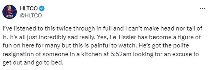 'Yes, Le Tissier has become a figure of fun on here for many but this is painful to watch. He’s got the polite resignation of someone in a kitchen at 5:52am looking for an excuse to get out and go to bed.'