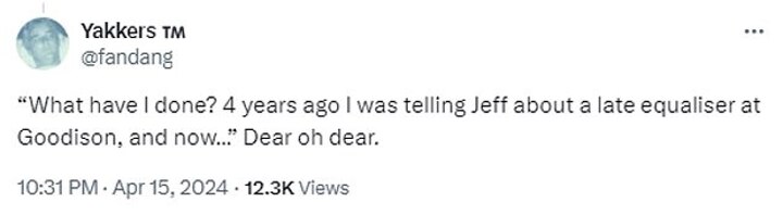 'What have I done? 4 years ago I was telling Jeff about a late equaliser at Goodison, and now…” Dear oh dear,' said a third, in reference to his position on the panel of Sky Sport's Soccer Saturday.