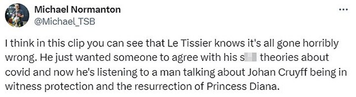 'I think in this clip you can see that Le Tissier knows it's all gone horribly wrong.' One user on X, formerly Twitter wrote. 'He just wanted someone to agree with his s*** theories about covid and now he's listening to a man talking about Johan Cruyff being in witness protection and the resurrection of Princess Diana.'