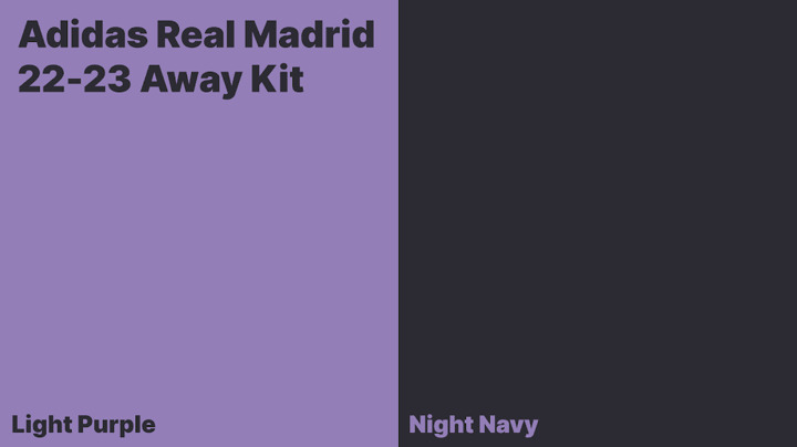 The Adidas Real Madrid 2022-23 away shirt is purple. The official color used is "Light Purple", which is also featured on the 22-23 home kit.