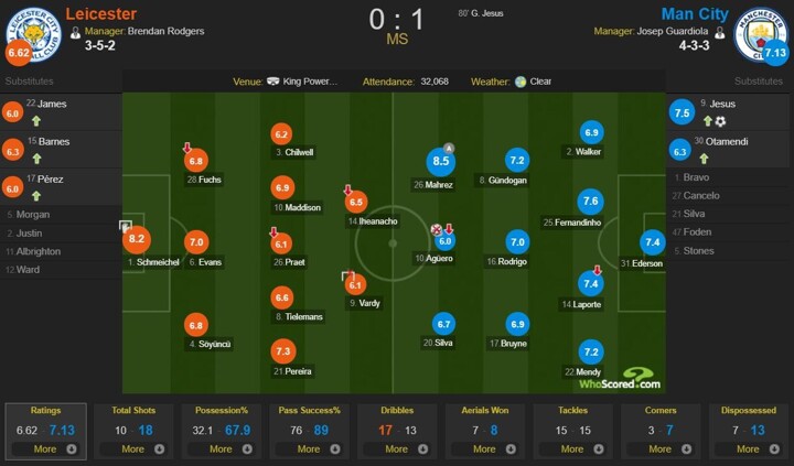 We bring you the player ratings for Leicester City vs Manchester City as Mahrez becomes Man of the Match with a rating of 8.5.