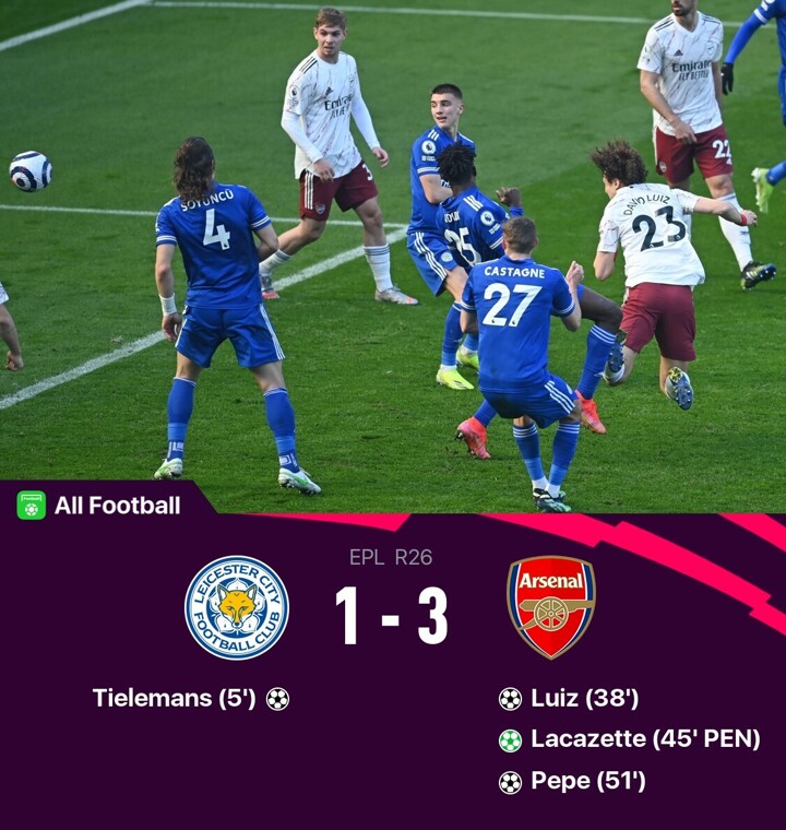 Alexandre Lacazette then put them ahead after the video assistant referee (VAR) judged that Wilfred Ndidi had blocked Nicolas Pepe's shot in the box with an outstretched arm.