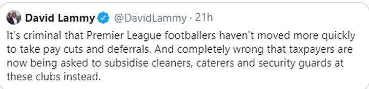 And Tottenham MP David Lammy said: 'It’s criminal that Premier League footballers haven’t moved more quickly to take pay cuts and deferrals. And completely wrong that taxpayers are now being asked to subsidise cleaners, caterers and security guards at these clubs instead'.