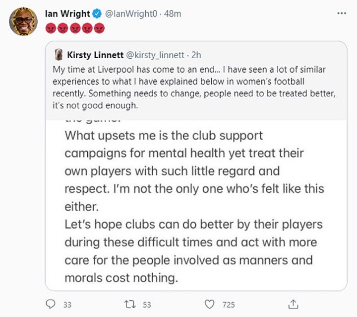 Arsenal legend Ian Wright, who is a big supporter of the women's game, quoted Linnett's tweet with five angry face emojis.
