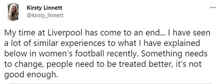 Her tweet, which was accompanied by a statement, read: 'My time at Liverpool has come to an end... I have seen a lot of similar experiences to what I have explained below in women's football recently. Something needs to change, people need to be treated better, it's not good enough.'