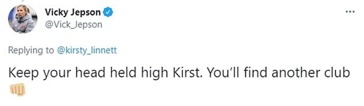 Former Reds boss Vicky Jepson replied to Linnett, saying: 'Keep your head held high Kirst. You'll find another club.'