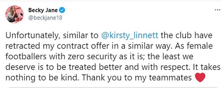 Quoting Linnett's tweet, Jane said: 'Unfortunately, similar to @kirsty_linnett the club have retracted my contact offer in a similar way. As female footballers with zero security as it isl the least we deserve is to be treated better and with respect. It takes nothing to be kind. Thank you to me teammates.'