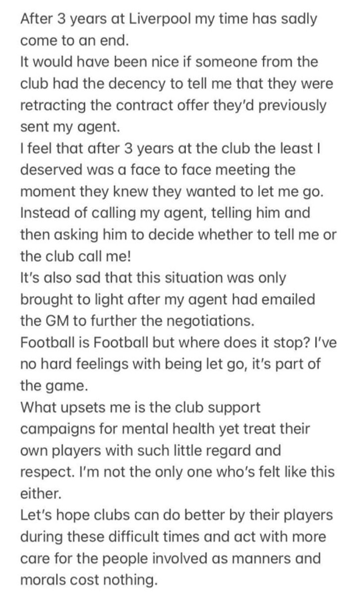 'It's also sad that this situation was only brought to light after my agent had emailed the GM to further the negotiations. Football is Football but where does it stop? I've no hard feelings with being let go, it's part of the game. What upsets me is the club support campaigns for mental health yet treat their own players with such little regard and respect. I'm not the only one who's felt like this either.