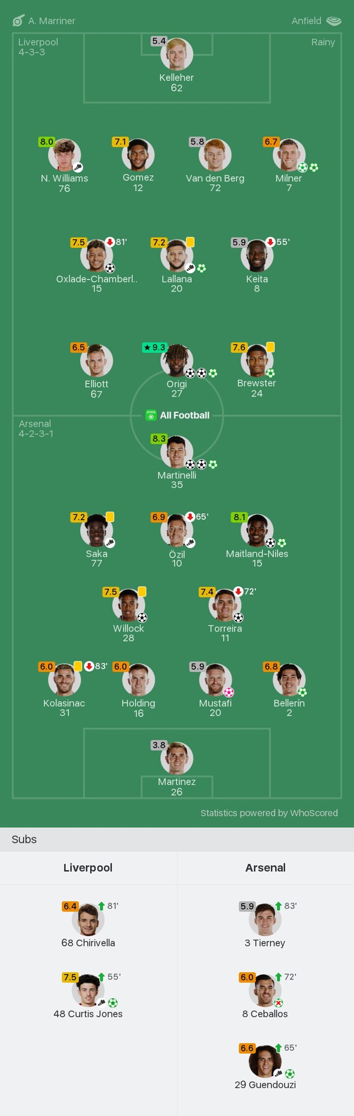 Elliot was then fouled in the box and Milner converted his penalty to make the score 3-2 at the break. Maitland-Niles restored the two-goal lead with a tap-in after Milner's soft back-pass allowed him to steal in. But then powerful efforts from Oxlade-Chamberlain and Origi brought the hosts level again.