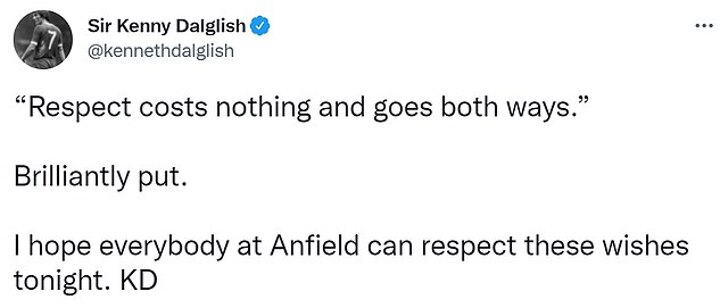 Club legend Kenny Dalglish echoed that message, saying: 'Respect costs nothing and goes both ways. Brilliantly put. I hope everybody at Anfield can respect these wishes tonight. KD.'