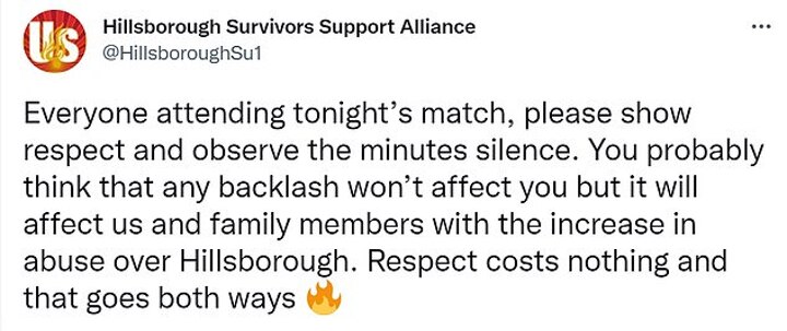 The Hillsborough Survivors Support Alliance group tweeted: 'Everyone attending tonight's match, please show respect and observe the minute's silence.