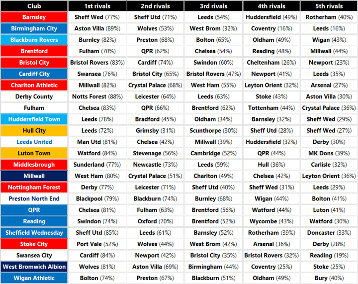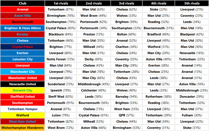 According to the data - which you can see compiled into a spreadsheet in the tweet further down - Manchester United, Manchester City and Everton all see Jurgen Klopp's side as their number one rival.