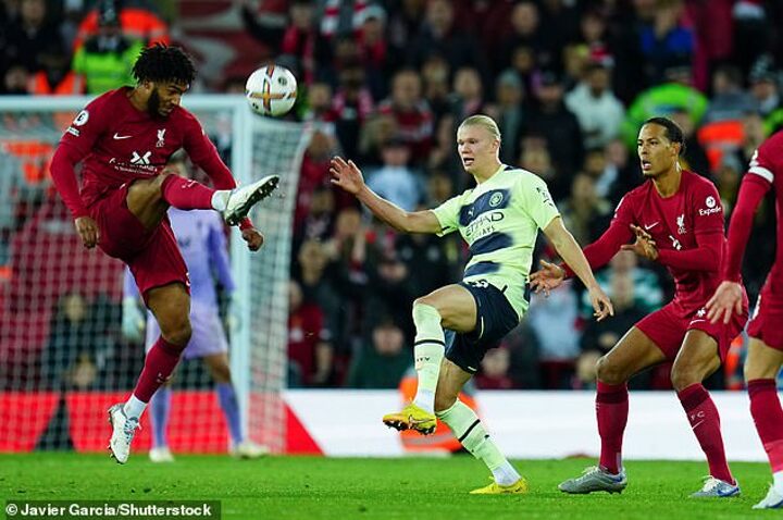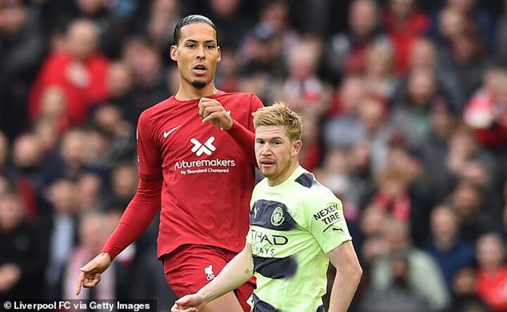 A Manchester City attack down the left ended with Joao Cancelo firing in a volleyed cross that was spearing towards Haaland in the middle. Van Dijk, however, watched it all the way and, from underneath his bar, he headed the ball to safety.