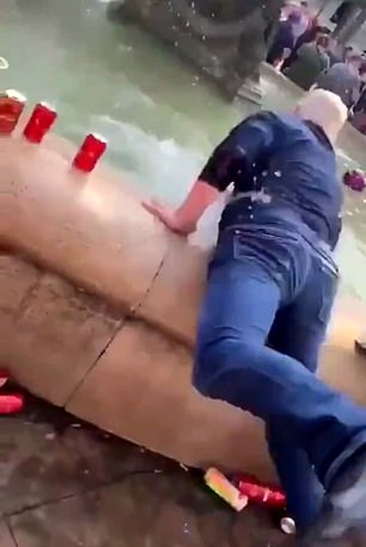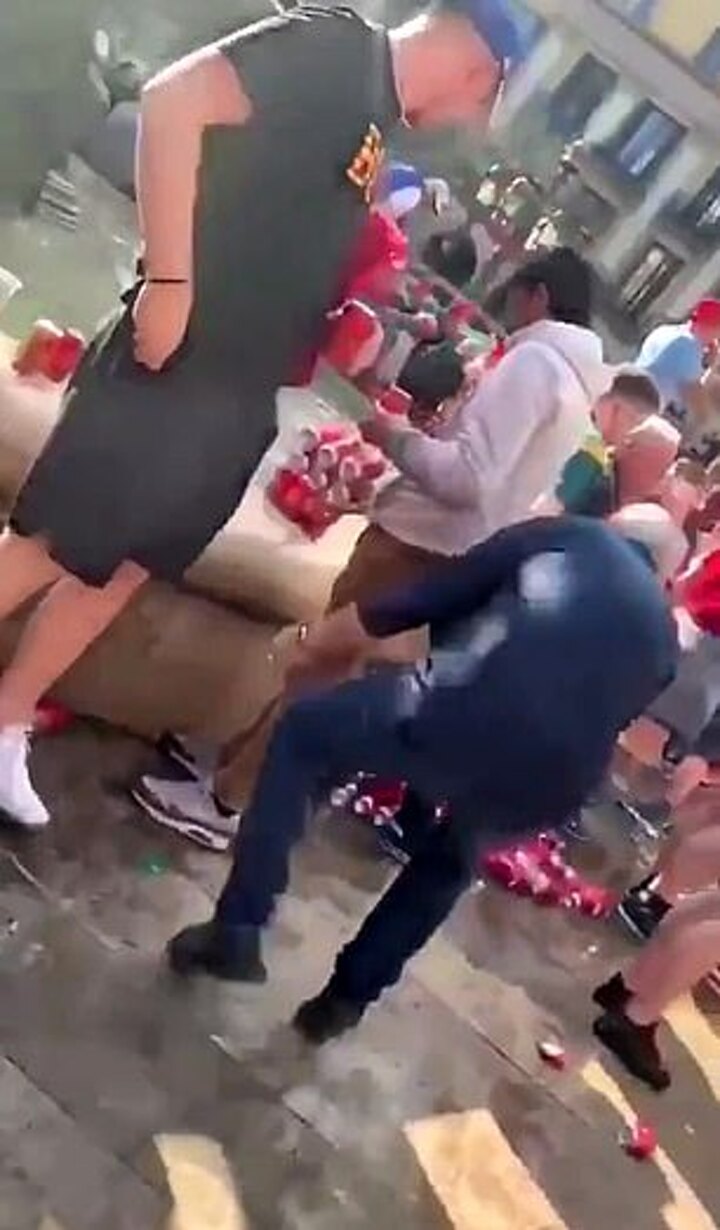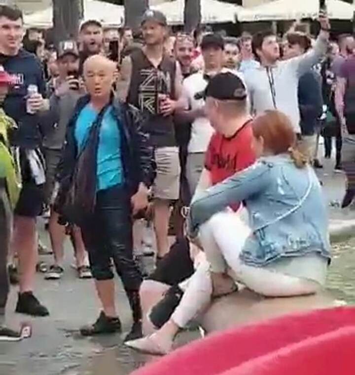 The incident is one of two filmed at the same location where Liverpool fans pushed unsuspecting locals into the fountain in the middle of the square.
