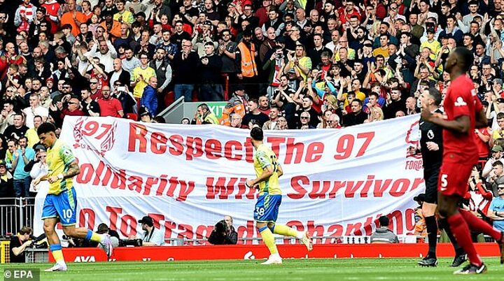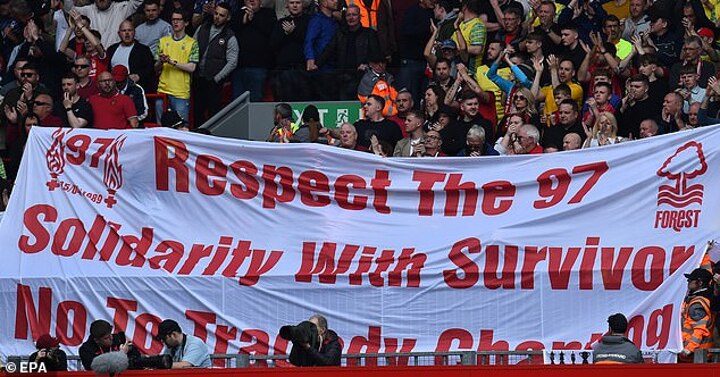 The message on the banner said: 'Respect the 97. Solidarity with survivors. No to tragedy chanting'.