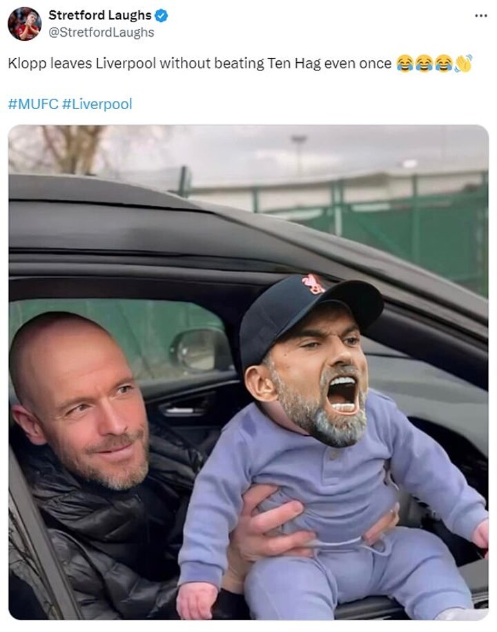 A third United fan posted: 'Klopp leaves Liverpool without beating Ten Hag even once,' accompanied by a series of laughing emojis and Klopp's face edited onto a baby being held by Ten Hag.