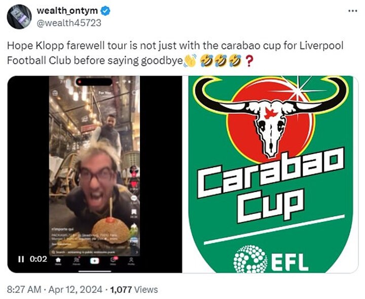'Hope Klopp farewell tour is not just with the carabao cup for Liverpool Football Club before saying goodbye,' one fan posted on X, accompanied by a video of a Klopp lookalike struggling on the floor in frustration.