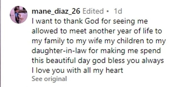 'I want to thank God for allowing me to celebrate another year of life, my family, my wife, my children, my daughter-in-law for making me spend this beautiful day,' Diaz Snr wrote on Instagram.