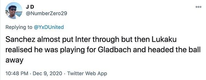 Meanwhile, @NumberZero29 tweeted: 'Sanchez almost put Inter through but then Lukaku realised he was playing for Gladbach and headed the ball away'.
