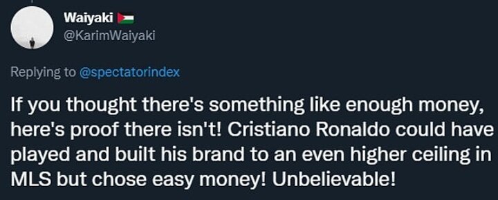'If you thought there's something like enough money, here's proof there isn't! Cristiano Ronaldo could have played and built his brand to an even higher ceiling in MLS but chose easy money! Unbelievable!,'