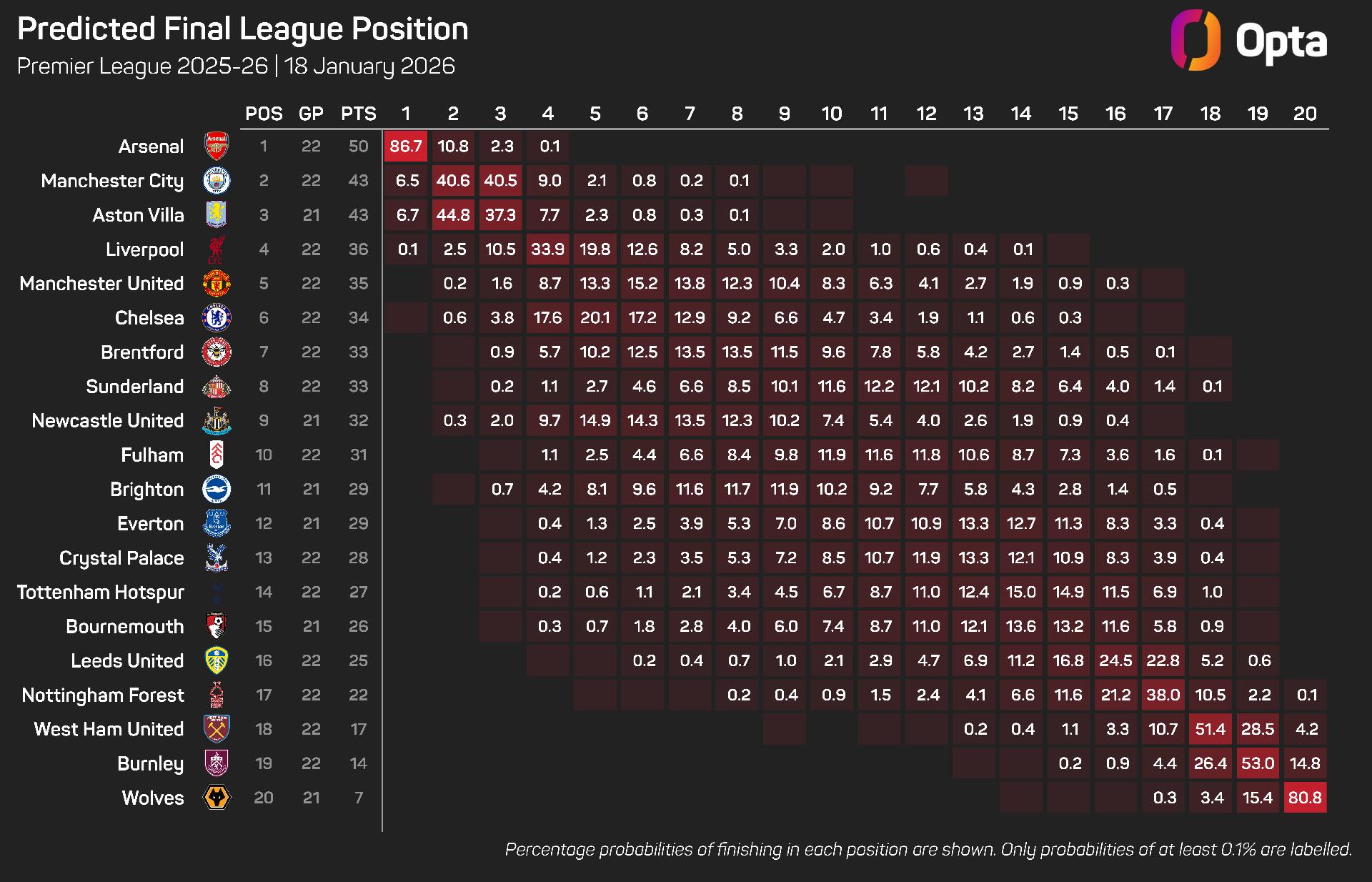 Arsenal are still given an 86.7% chance of clinching their first Premier League title since 2004, according to the Opta supercomputer, while their hopes of winning the Champions League, where they sit top of the league standings, are also the highest of any team at 26%.