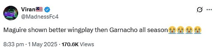 'Maguire shown better wingplay than Garnacho all season,' the fan posted on X.