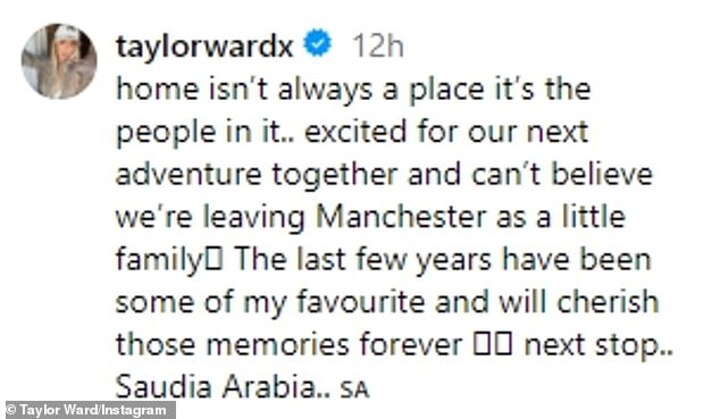 She wrote: 'Home isn't always a place it's the people in it.. excited for our next adventure together and can't believe we're leaving Manchester as a little family.