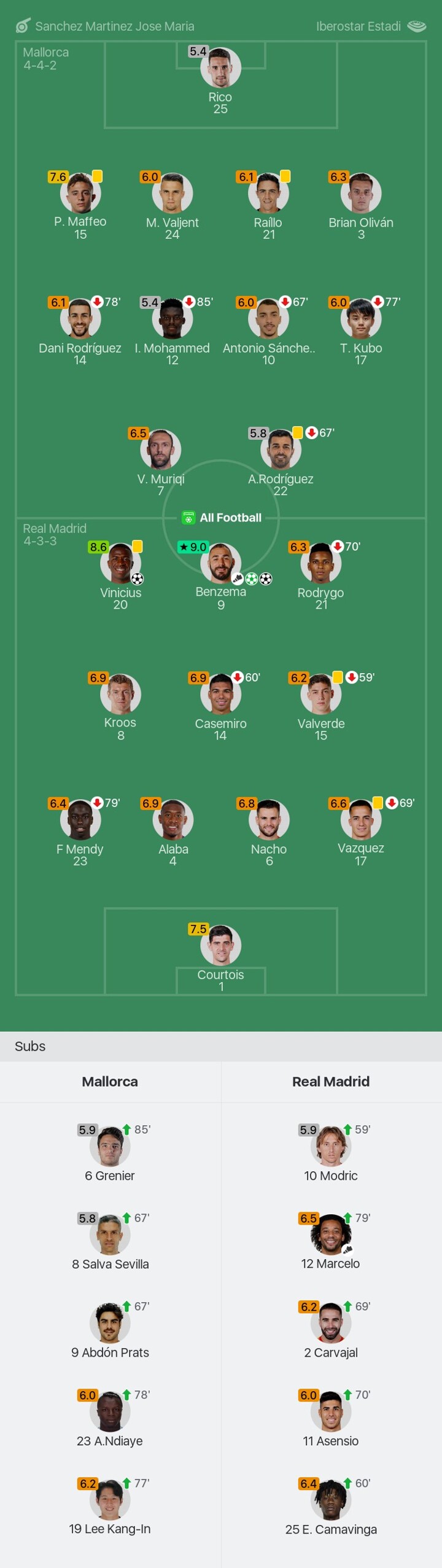 We bring you the player ratings for Mallorca vs Real Madrid as Benzema becomes Man of the Match with a rating of 9.0.