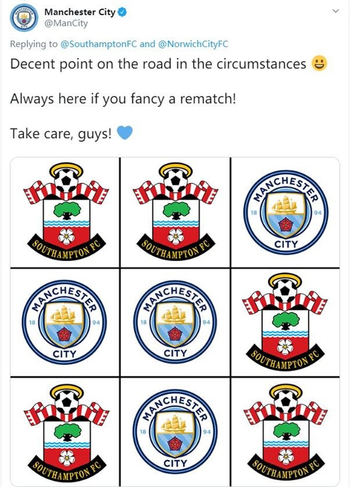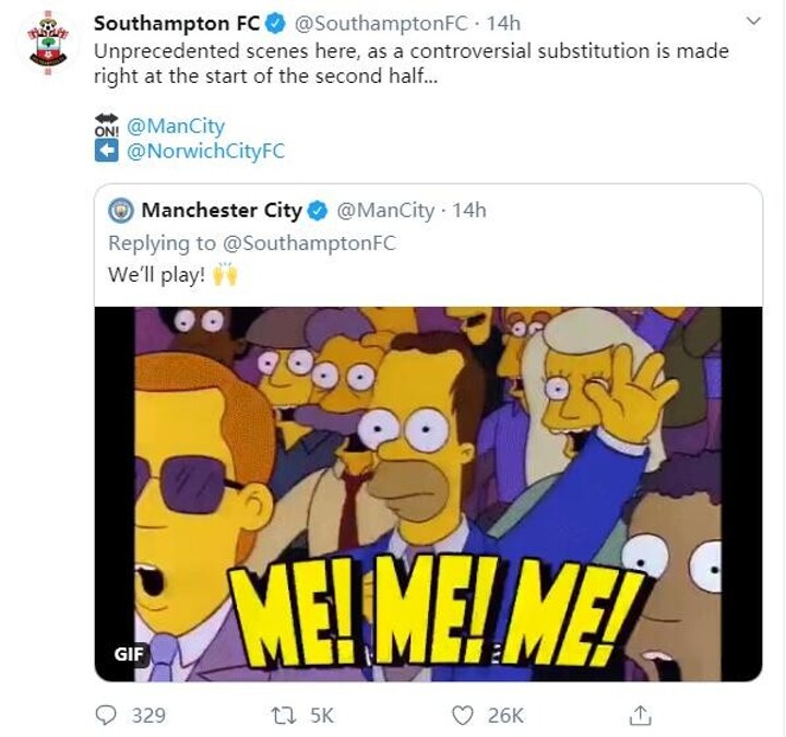 Then Man City's twitter offered to take over from Southampton, saying they want to replace Norwich in the game. So they made the substitution at the start of the second half.