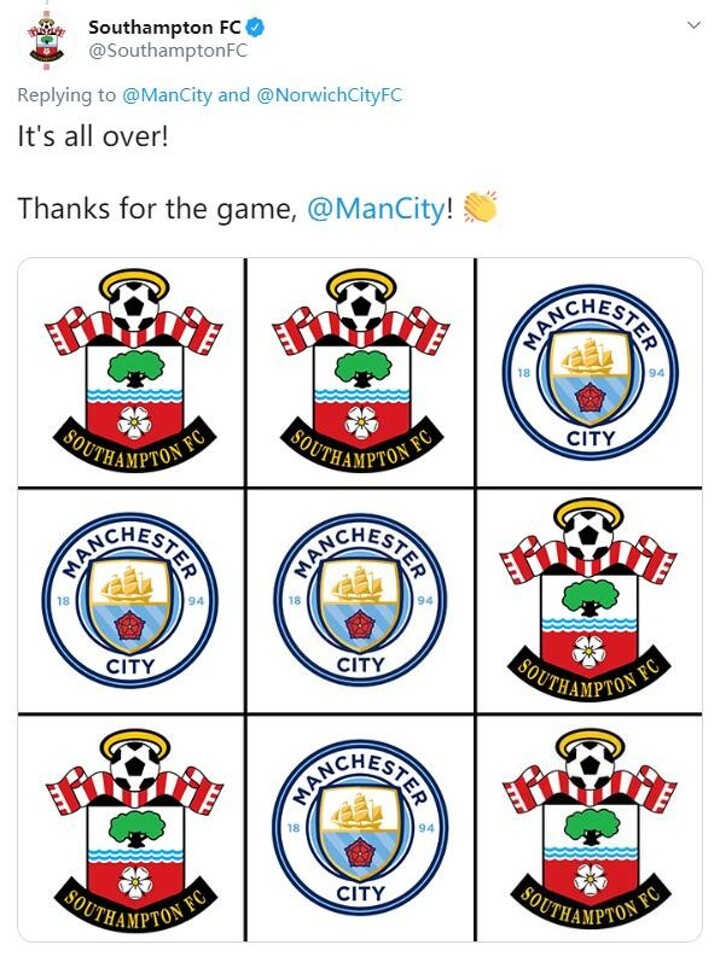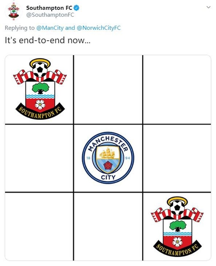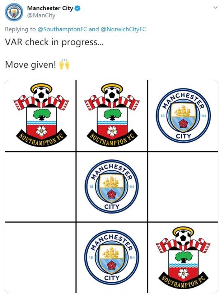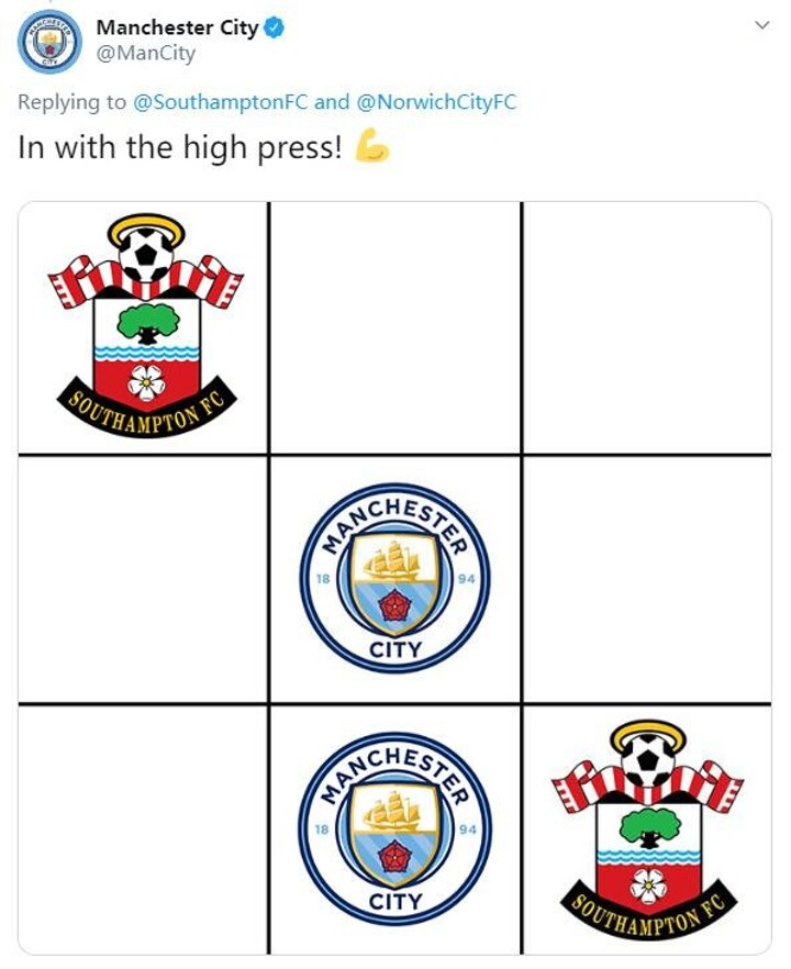 With the Premier League suspended until April 3 at the very earliest, Manchester City and Southampton went to battle on Twitter, engaging in a fiercely close battle of tic-tac-toe.