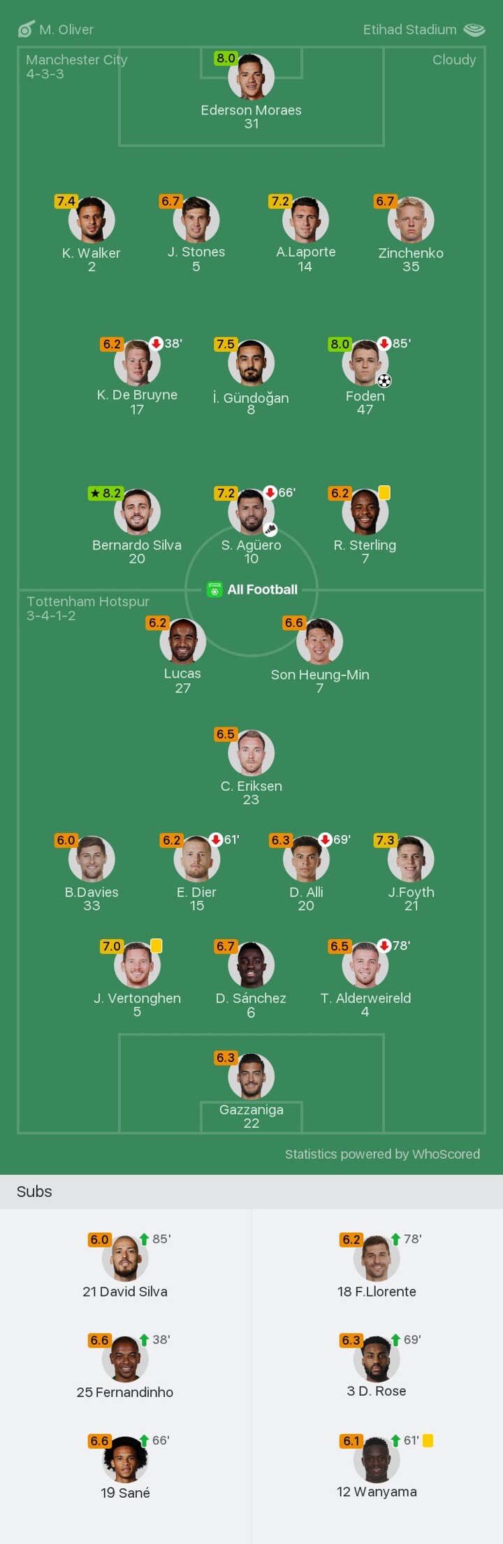 We bring you the player ratings for Manchester City vs Tottenham Hotspur as Bernardo Silva becomes Man of the Match with a rating of 8.2.
