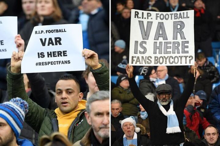 The signs read: "R.I.P FOOTBALL VAR IS HERE #RESPECTFANS."