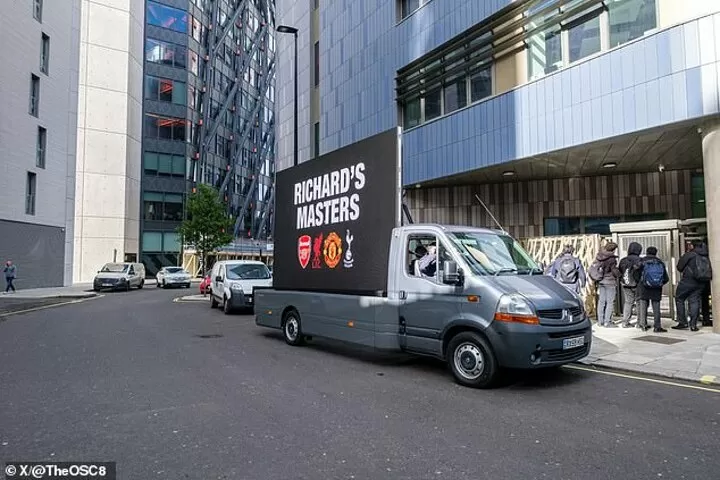 However, execs from across the top flight had to walk past a flatbed truck which featured an LED board showing the badges of Arsenal, Liverpool, Manchester United and Spurs with the caption ‘Richard’s Masters’ – a not-so thinly-veiled dig at Premier League boss Richard Masters.
