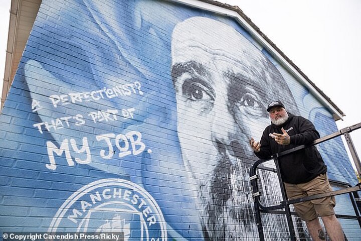 ‘A perfectionist? That’s part of my job,’ reads the quote alongside Guardiola’s face, painted by Mr Meana and Snotone. The locals on the estate have taken to it. Especially the lady who owns the house, a City fan who has lived on the close for more than 30 years.